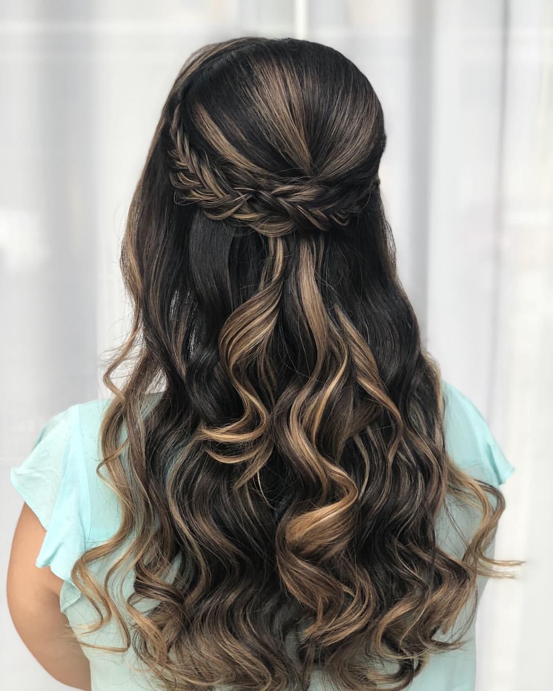 Очень красивой и оригинальной выглядит укладка на полу распущенных волосах с косой. Такой вариант причёски может быть дополнительно украшен красиво уложенной чёлкой или ниспадающими прядями возле лба.