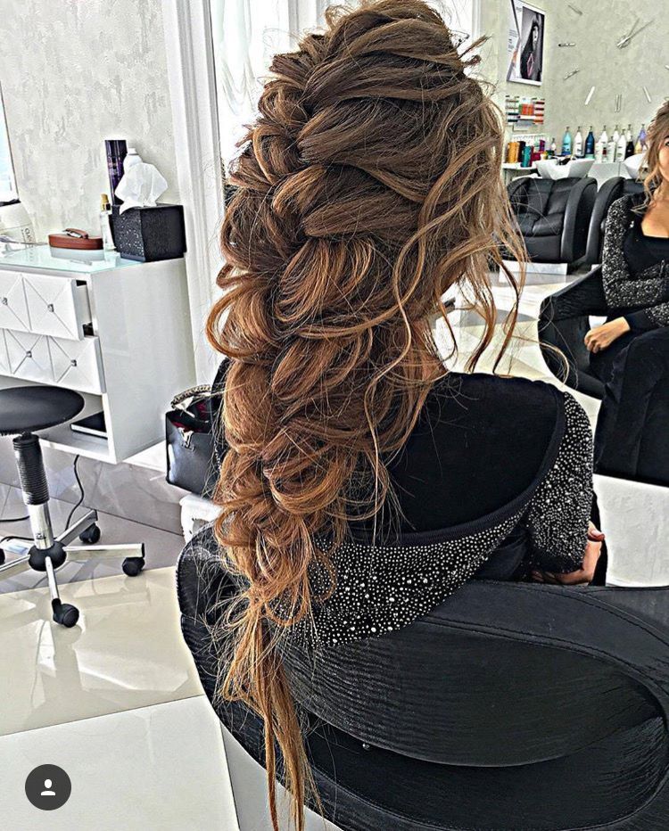 Особенно эффектно она будет смотреться на длинных волосах. Тебе нужно всего лишь тщательно «залачить» волосы на затылке и прокрутить одну прядь вокруг основания хвоста. Ярким акцентом могут стать сережки и украшения!
