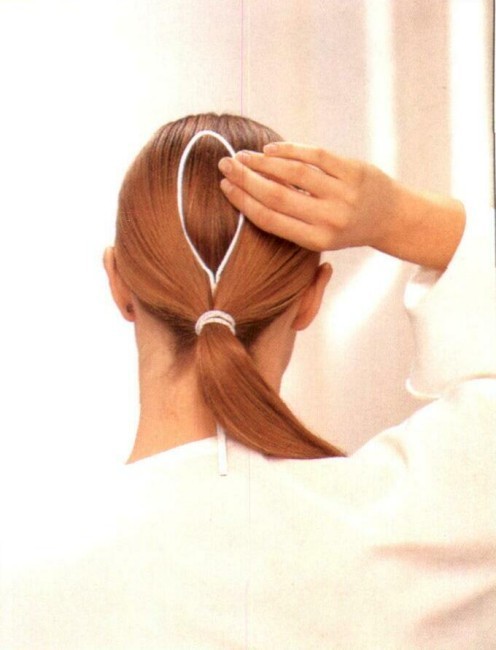 - В петлю проденьте прядь средней толщины снизу хвоста.