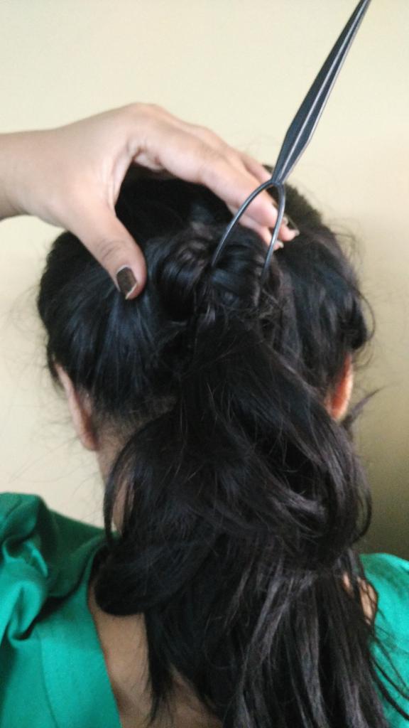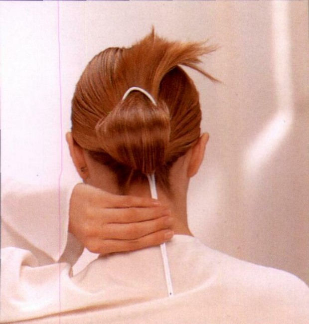 Необходимо сделать хвост на том уровне, на котором будет прическа, после чего слегка ослабить резинку. После этого продеть волосы в петлю и воткнуть стайлер в середину хвоста сверху вниз. Если прическа делается высоко, наклоните голову. Будет удобнее.