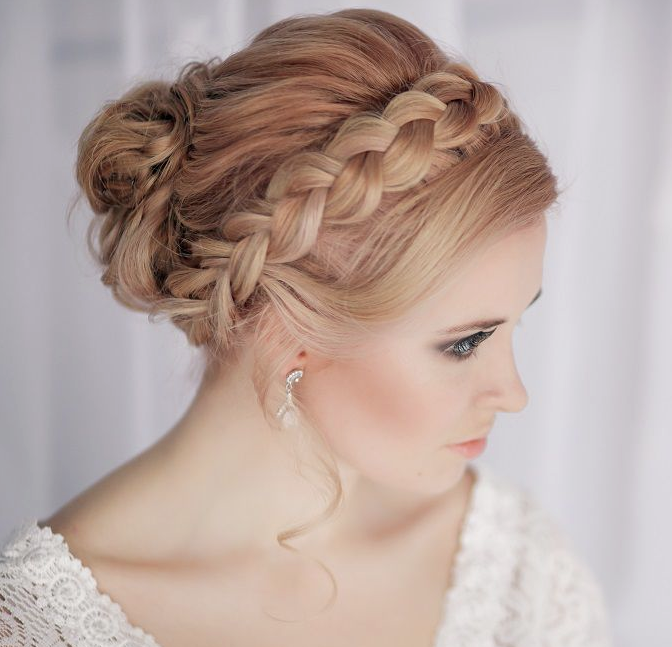 - Окончательно прическу фиксируют при помощи шпилек. Получается пучок вокруг шиньона с элементами плетения.
