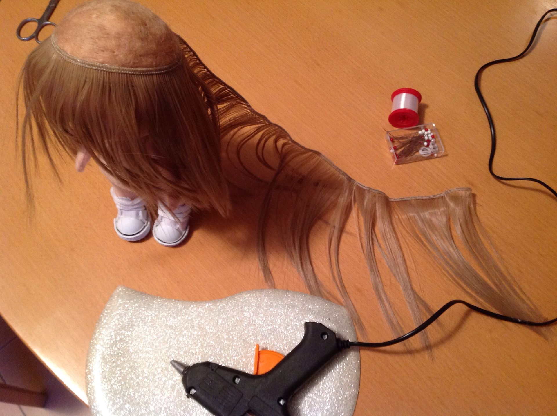 Волосы лучше купить на трессах (прошитая машинной строчкой полоса). Приклеивать их можно непосредственно в покупном виде, переделать для густоты либо отрезать строчку, накладывать прядями. Возможно совмещение несколькими вариантами.