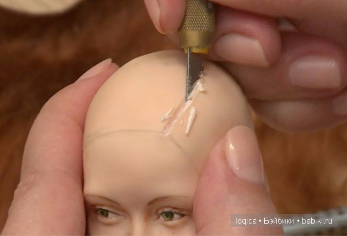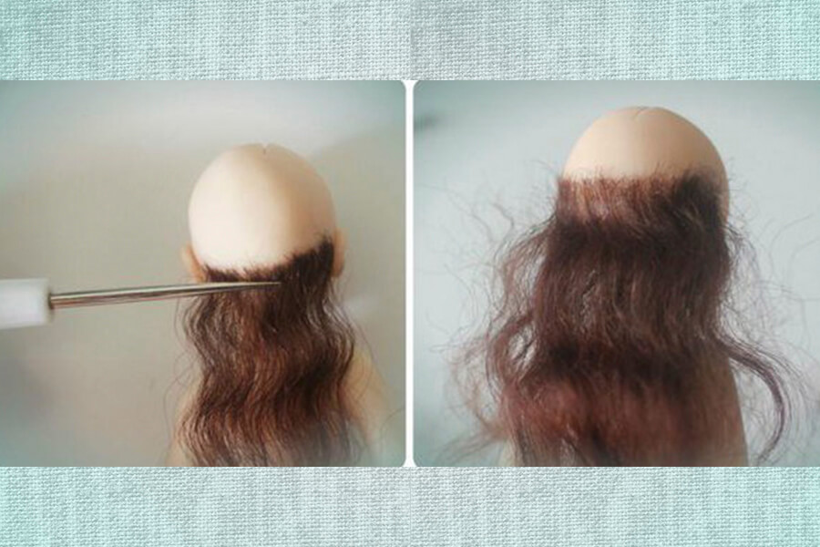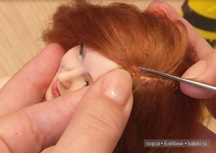Есть вариант, где линия пробора прорезается в голове куклы, пряди закладываются в углубление и фиксируются.
