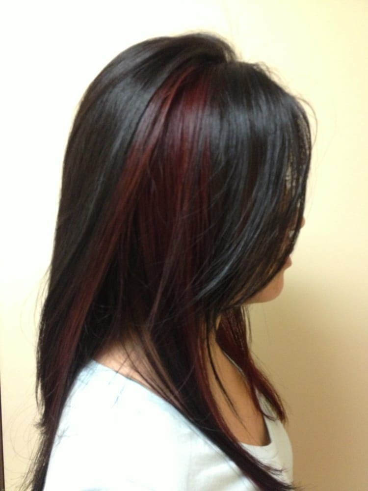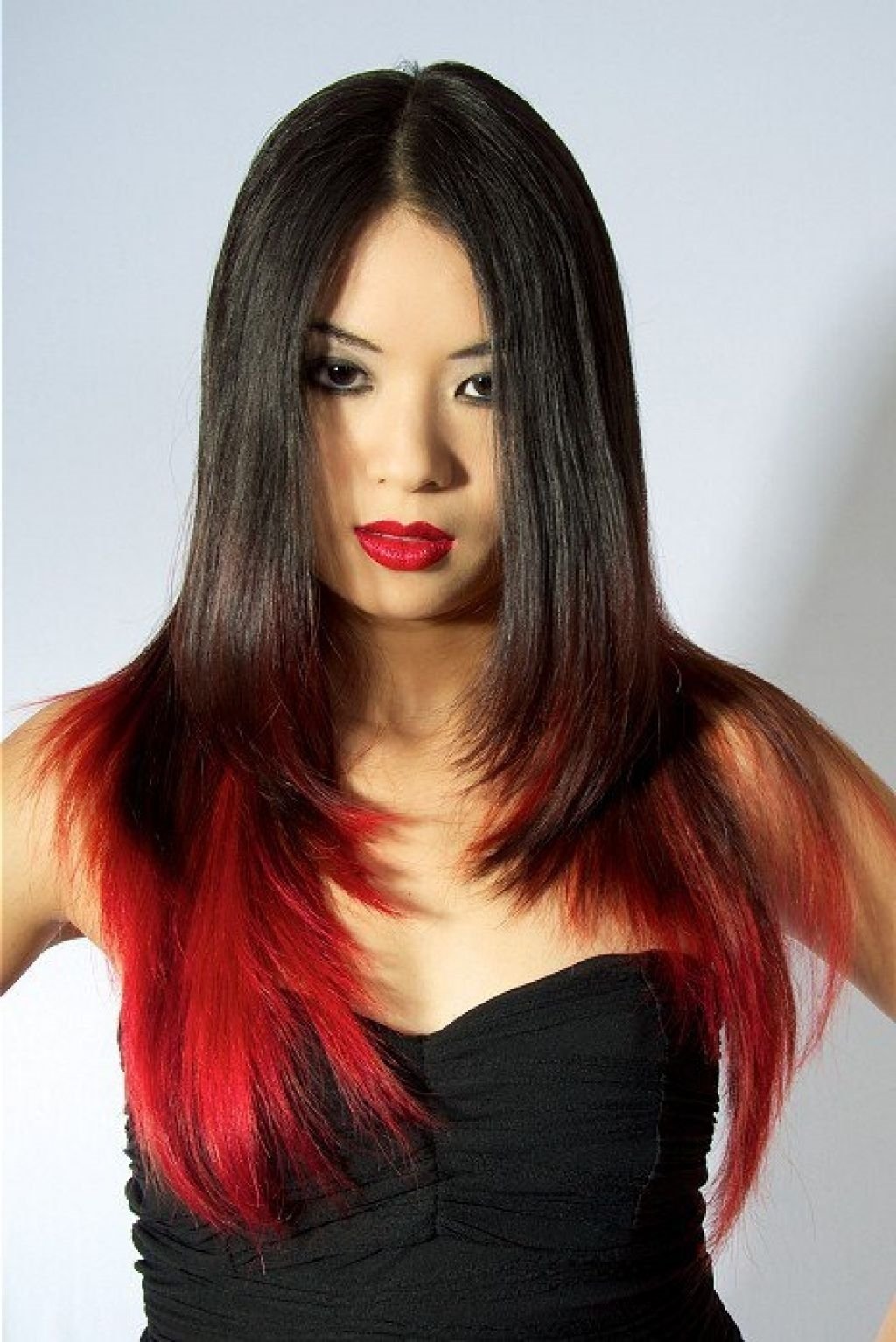 - огненно-красные пряди в сочетании с черным цветом волос выглядят эффектно на девушках с яркой внешностью.