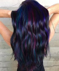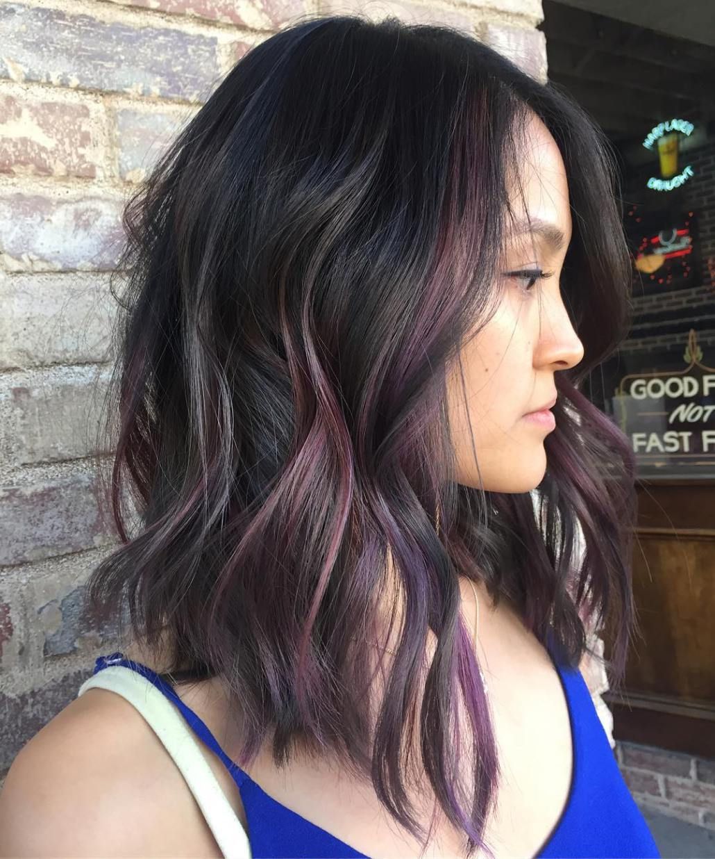 Говоря о потрясающих вариантах окраски волос, в моде черные волосы с фиолетовыми бликами! Этот модный цвет сохраняет ваши корни красивыми и темными и превращает их в очень красивый фиолетовый оттенок. Не для слабонервных, вы можете ожидать, что этот цвет волос окажет большое влияние. Посмотрите, о чем идет речь — на день — с помощью пурпурного временного спрея-краски для волос на 1 день для макияжа волос L’Oréal Paris Colorista Hair Makeup Temporary 1-Day.