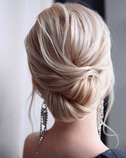 Обычно это низкий пучок, может быть расположен асимметрично, завязан так, чтобы из него выбивались даже не отдельные волоски, а целые пряди, но тонкие, изящные.
