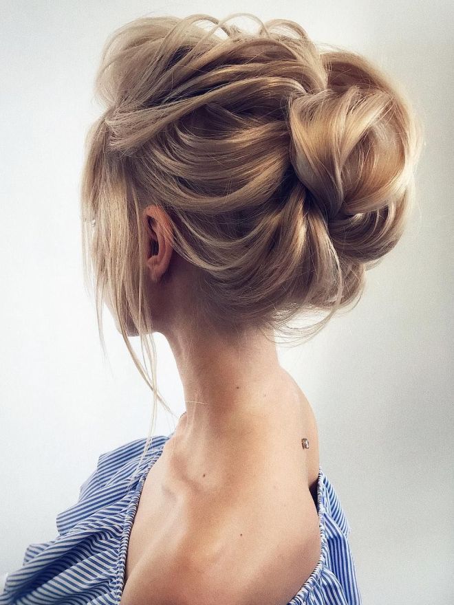 Начесы, повороты, косы, переходящие в пучок, или хорошо подобранные аксессуары часто используются, чтобы поднять прическу с низким пучком. - Пучок на макушке: пучок с высоким узлом, небрежный пучок или пучок косички объединяет одна и та же идея размещения пучка на макушке для максимального внимания. Прически с высоким пучком могут быть эффектными и идеально удлиняют лицо.
