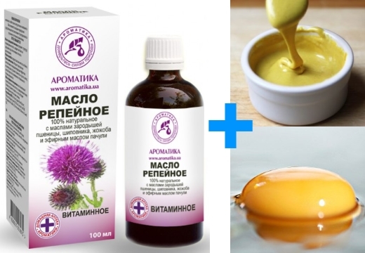 Видимый результат последует после 6-8 недель регулярного проведения данной процедуры. Данное масло прекрасно работает в тандеме с другими продуктами. Так, при желании можно составить целую композицию из масел для усиления целебного эффекта – с репейным отлично сочетаются оливковое, мяты перечной, чайного дерева. Все ингредиенты смешиваются в сухой емкости, которая потом подогревается на паровой бане для активизации их действия.