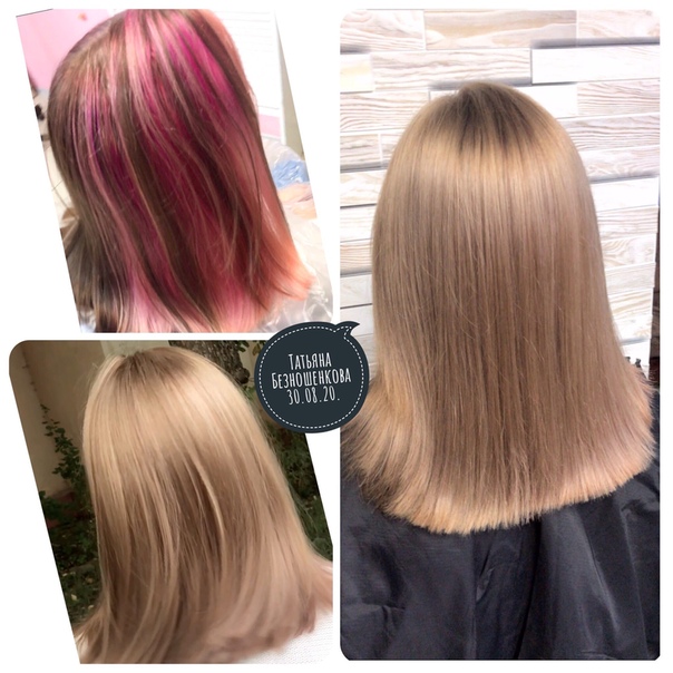 Из непонятного желтого оттенка (к сожалению, не всегда после осветлением порошком получается равномерный цвет волос) можно получить ровный красивый оттенок.При тонировании можно корректировать оттенок краски. Например я не люблю серые или фиолетовые оттенки у блонда, решить эту проблему очень просто, нужно просто добавить нейтральный корректор цвета в краску при смешивании.