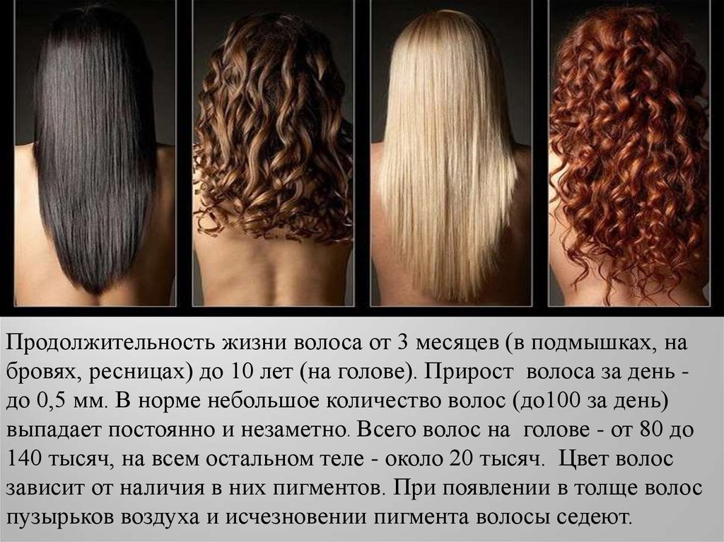 Рост волос состоит из четырех отдельных стадий- Фаза анагена длится 3-5 лет; волосы на голове растут примерно на дюйм в месяц, летом быстрее, чем зимой; один волос может расти в течение семи лет и достигать метра в длину.