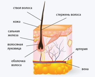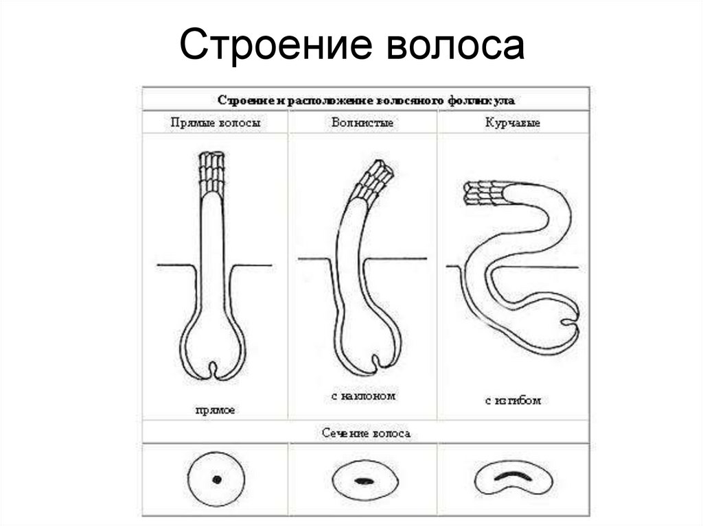 Волос делится на ствол (стержень) и корень. Стержень волоса— это видимая часть, расположенная над поверхностью кожи. Корень волоса находится в толще кожи (дерме) и залегает в ней на различной глубине (примерно 2-2,5мм).