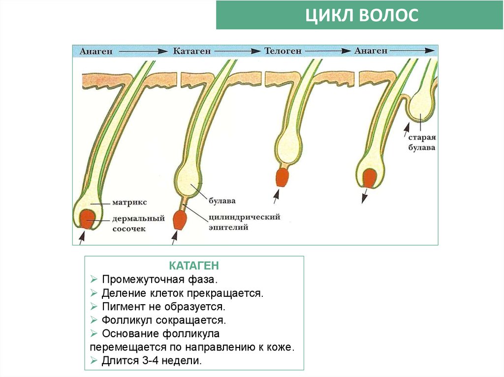 Волос растет непостоянно. В своем росте он имеет три стадии: стадия анагена, катагена и телогена.