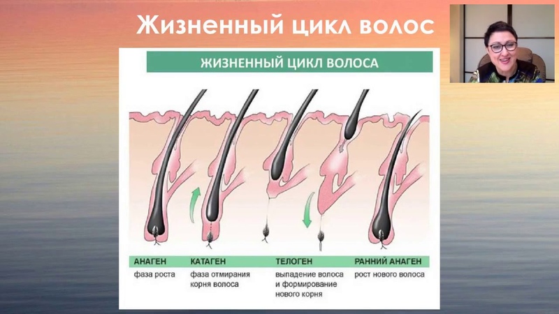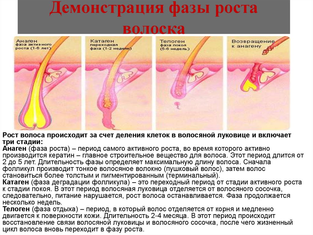 Анаген – фаза роста, катоген – переходная фаза и телоген – стадия выпадения.