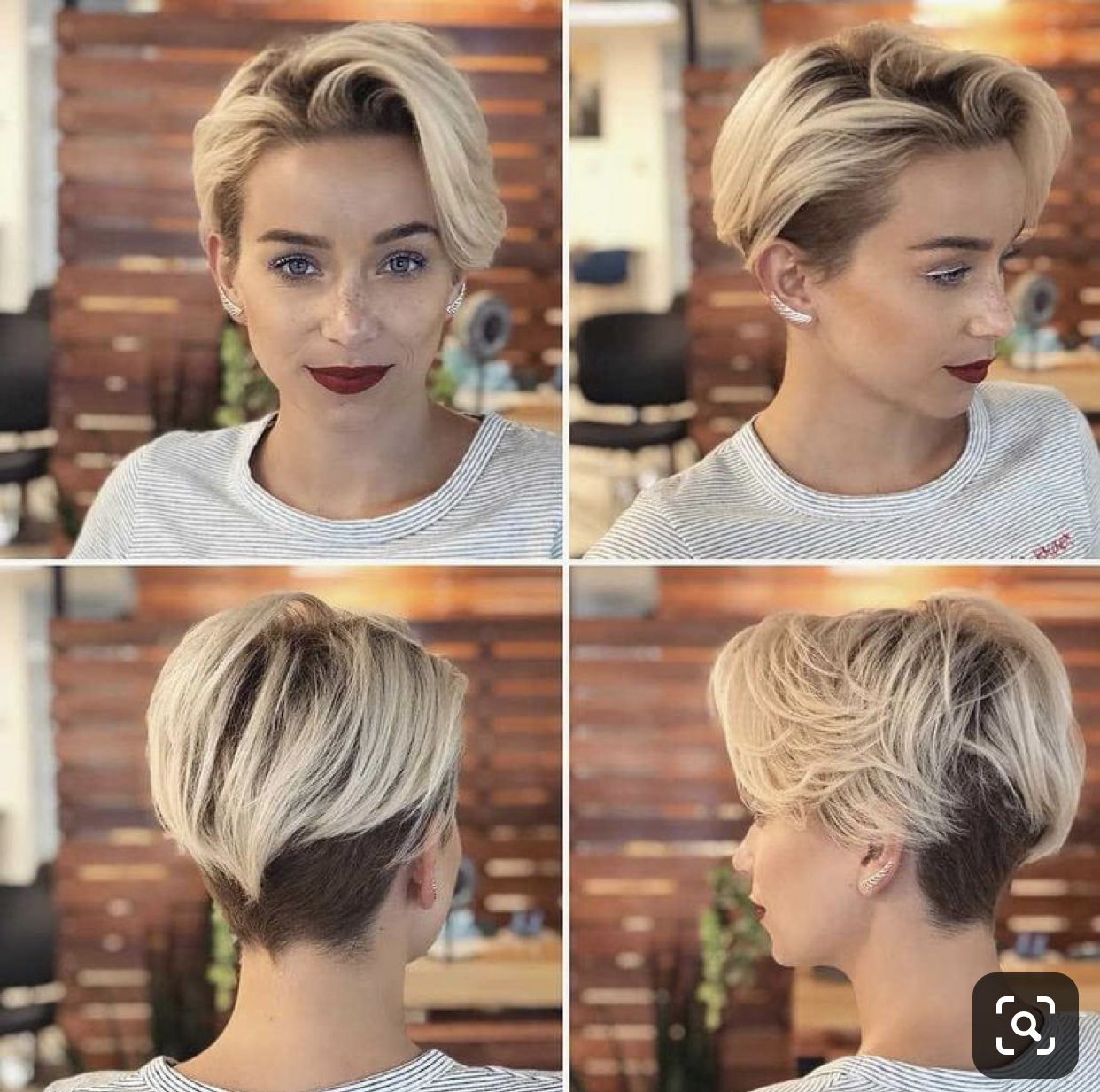 Прическа пикси с выбритым затылком via Прическа пикси выглядит более современно и современно-шикарно за счет обрезанных кончиков. Он идеален для создания резкого панковского стиля на коротких светлых волосах.