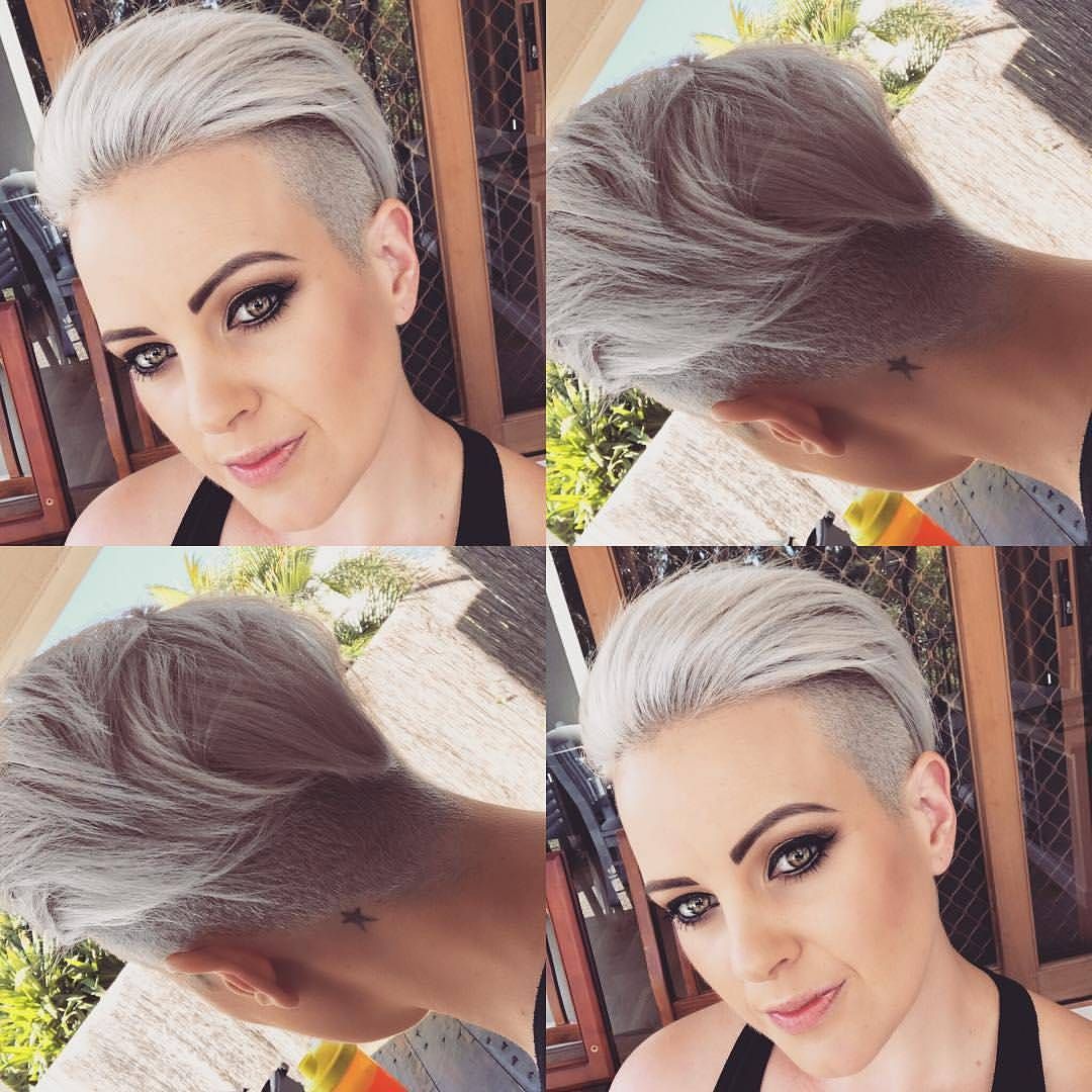 Прическа с короткой стрижкой для светлых волос via Длинные верхние слои, уложенные сзади, сильно контрастируют с выбритыми боками.