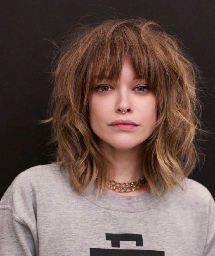 Рваная челка — это действительно актуальный стиль, который идеально смотрится на обладательницах густых волос. Данный вид челки обычно закрывает лоб, но не обрезаются так линейно, как прямые челки. Рваный край скрывает часть тяжести и суровости лица, которым придает прямая челка, однако он также привлекают внимание к глазам.