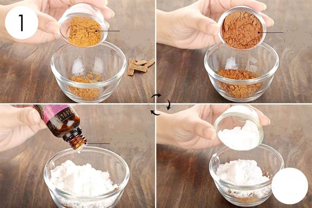 Смешайте ¼ стакана кукурузного крахмала, ¼ стакана пищевой соды и 1 столовую ложку какао-порошка.