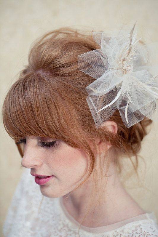 Свадебная прическа с высоким пучком на короткие волосыРазделите волосы на секции, оставляя при этом некоторые пряди впереди. Используйте лак для волос, чтобы как можно лучше начесать каждую секцию. Поднимите часть волос спереди и волосы от висков к задней части шеи. В конце, возьмите пряди впереди, которые остались и поместите их сверху для более равномерного вида.