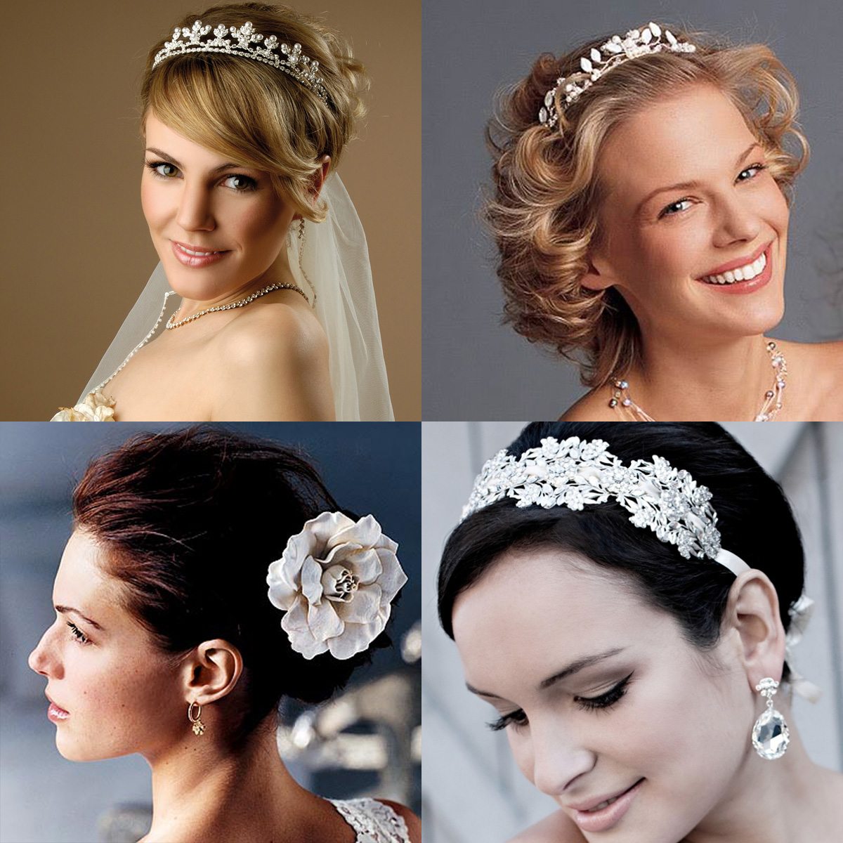 Элементарные прически коротких волос всегда можно дополнить богатыми аксессуарами. Диадемы и тиары с крупными камнями, бусинами и кружевами сделают обычный хвостик или «гульку» более чем очаровательными. Так простой свадебный пучок с короной будет замечательно смотреться и с пышным декорированным платьем, и с простым облегающим покроем свадебного наряда.