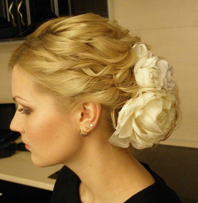 Начешите макушку перед тем, как сметать слои, закрепив заколками-невидимками и вставив несколько свежих цветов.
