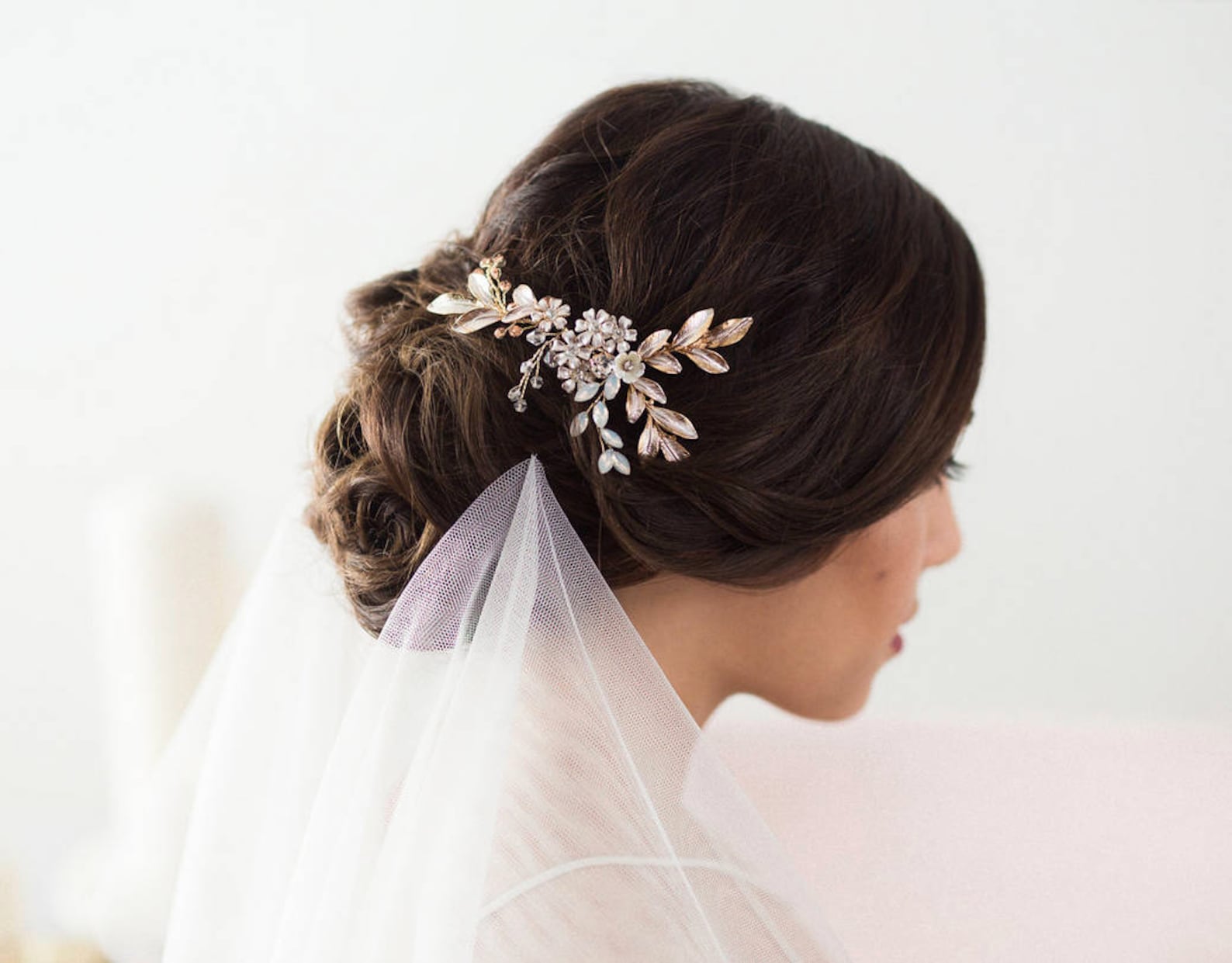 Чтобы прозрачная и простая вуаль, свисающая сзади, казалась еще более особенной, попробуйте дополнить аксессуарами идеально уложенный пучок или шиньон. «Это отличный аксессуар, который можно носить поверх прически, которая находится на нижней части затылка», — говорит свадебный стилист Антуан Брешу. «К прическе можно добавить цветы или заколки, чтобы придать образу мягкость, свежесть и индивидуальность».