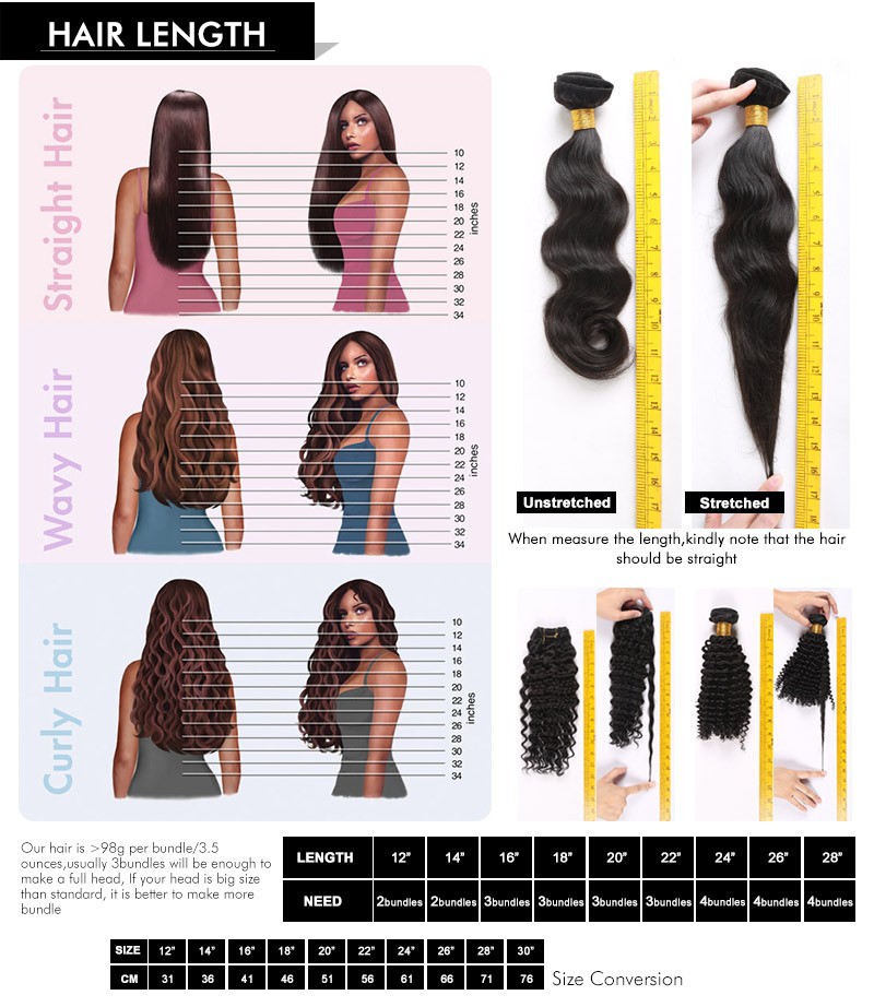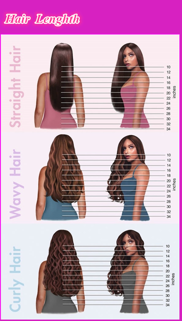 Вы либо говорите, куда бы вы хотели, чтобы ваши локоны прибыли, ссылаясь на части вашего тела, либо точно указываете желаемую длину волос в дюймах. Оба способа могут быть представлены на диаграмме волос.
