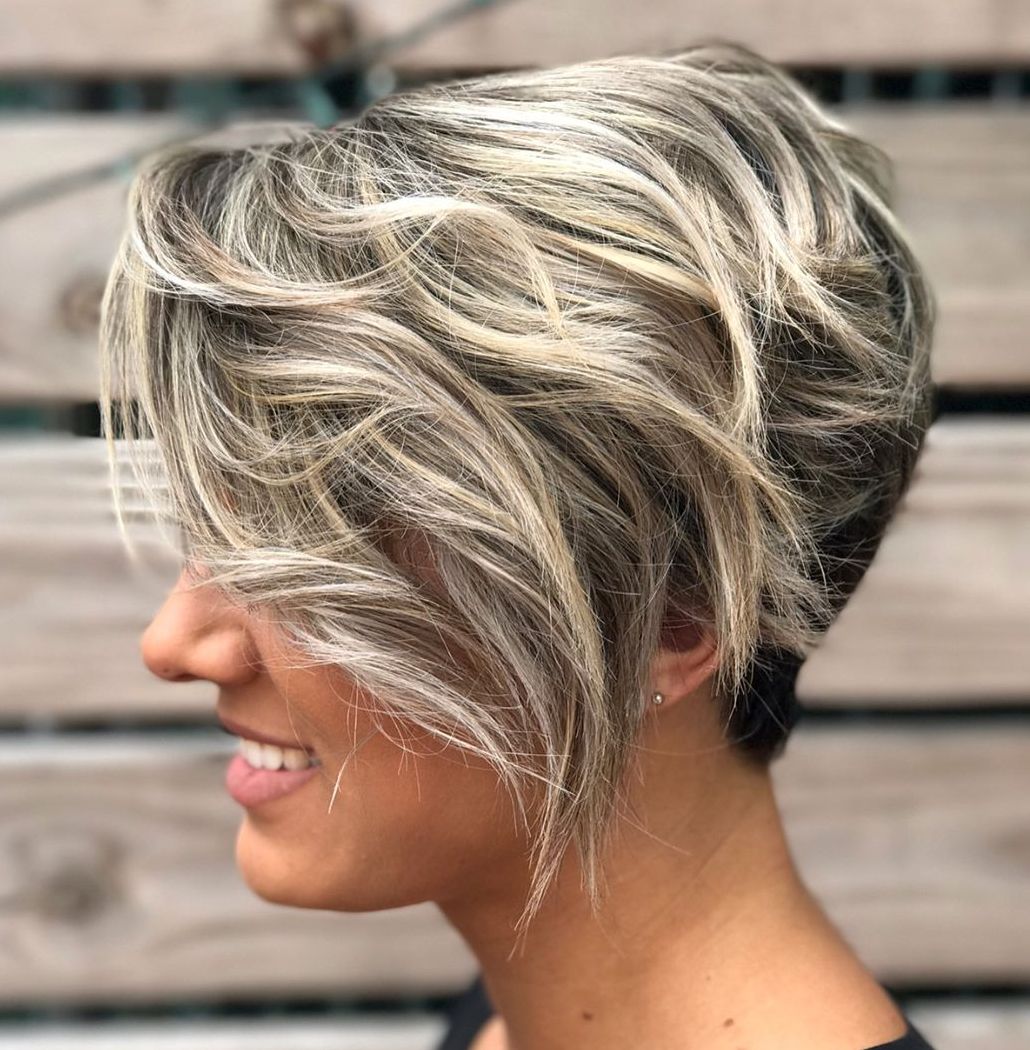 Существует отличный контраст между пепельно-коричневым и ледяным блондом. Взъерошенный вид придает волосам дополнительную глубину, а блики, обрамляющие лицо, — такое приятное прикосновение. Яркий, а также красивый.