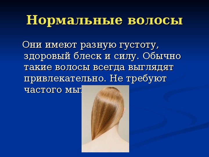 - Легче всего отличить нормальный тип. Они эластичны, красивы, легко поддаются укладке и смотрятся здоровыми. Те мужчины, у кого волосы нормального типа, могут не переживать и не бояться возникновения перхоти.
