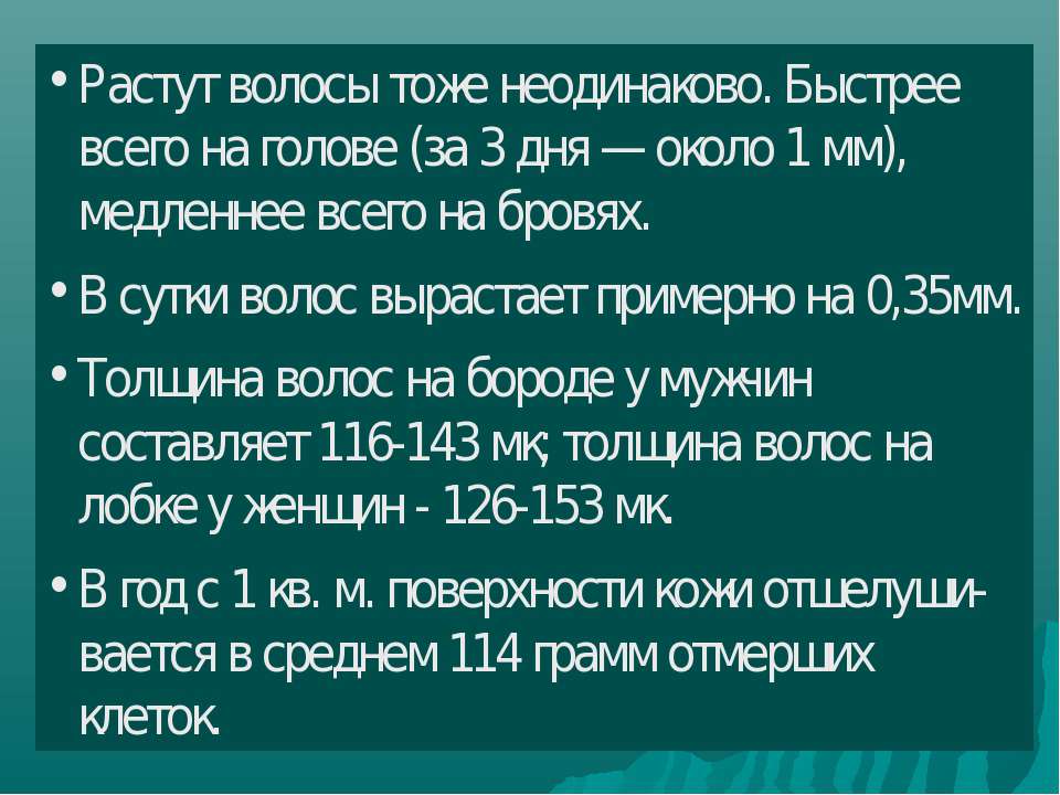 «Наши волосы являются придатками кожи, поэтому они находятся в прямой от нее зависимости. Действует правило: чем тоньше у человека кожа, тем тоньше волосы, и наоборот. У блондинок (блондинов) самые тонкие волосы; у брюнеток (брюнетов) – толщина в несколько раз больше, а самые толстые — у шатенок (шатенов).