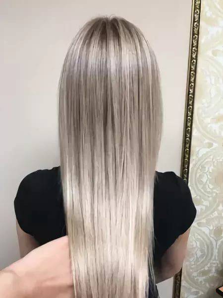 Насыщенный серебристый блонд 100B на синей основе («B» означает «синий») для получения чистого серебристо-белого блонда.