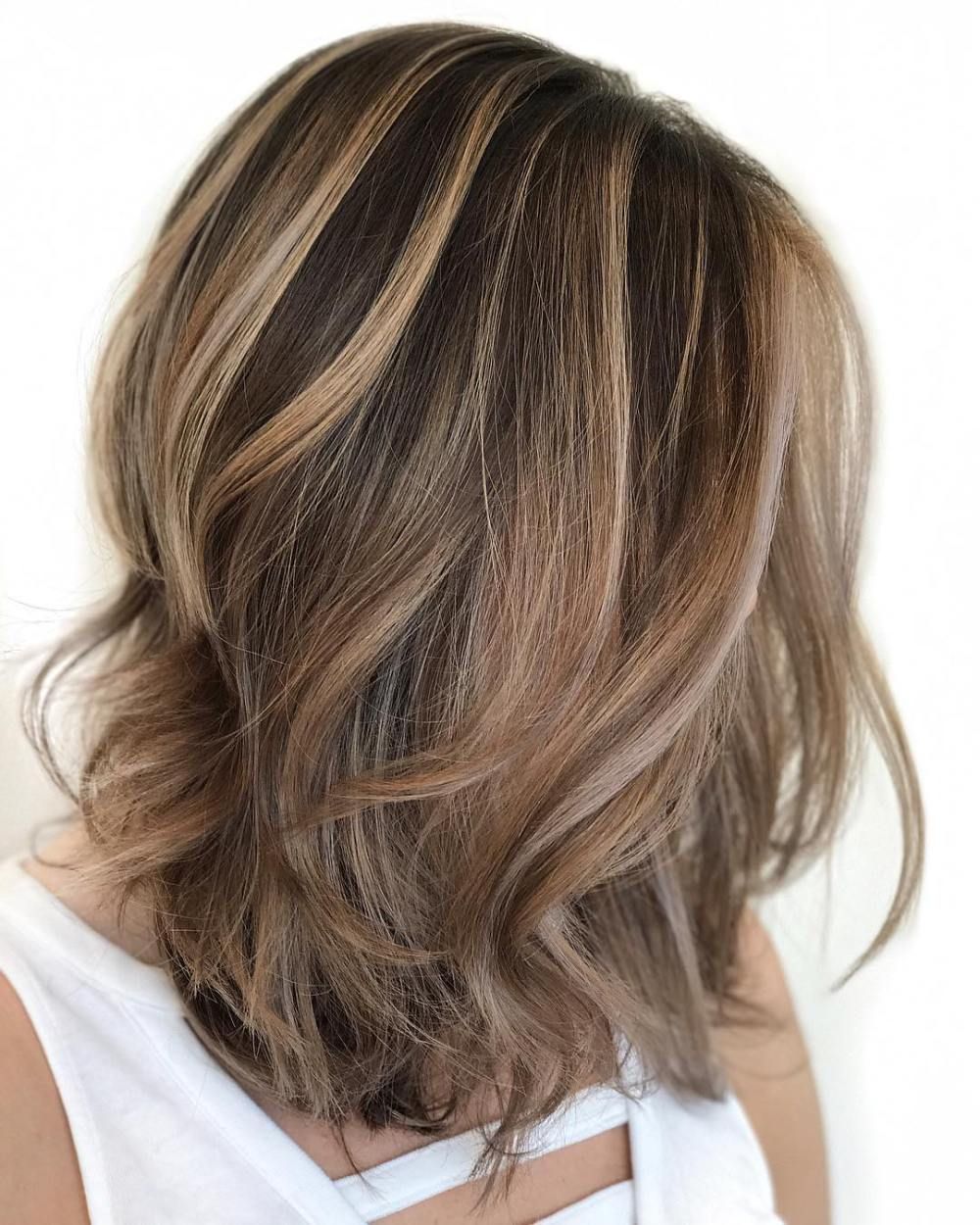 средние многослойные темные волосы с мелированием