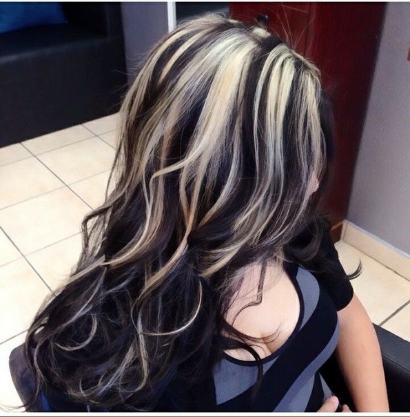 Часть прядей обесцвечивается до 10 уровня и выше, остальные тонируются в черный цвет. Такое окрашивание эффектно смотрится на темно-русых или коричневых волосах.