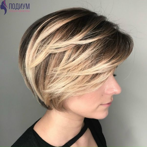 - Идеальным вариантом для коротких прядей считается технология балаяж. Градуированную стрижку можно сделать более оригинальной и яркой. При окрашивании волос техникой балаяж краситель наносится лишь на кончики.