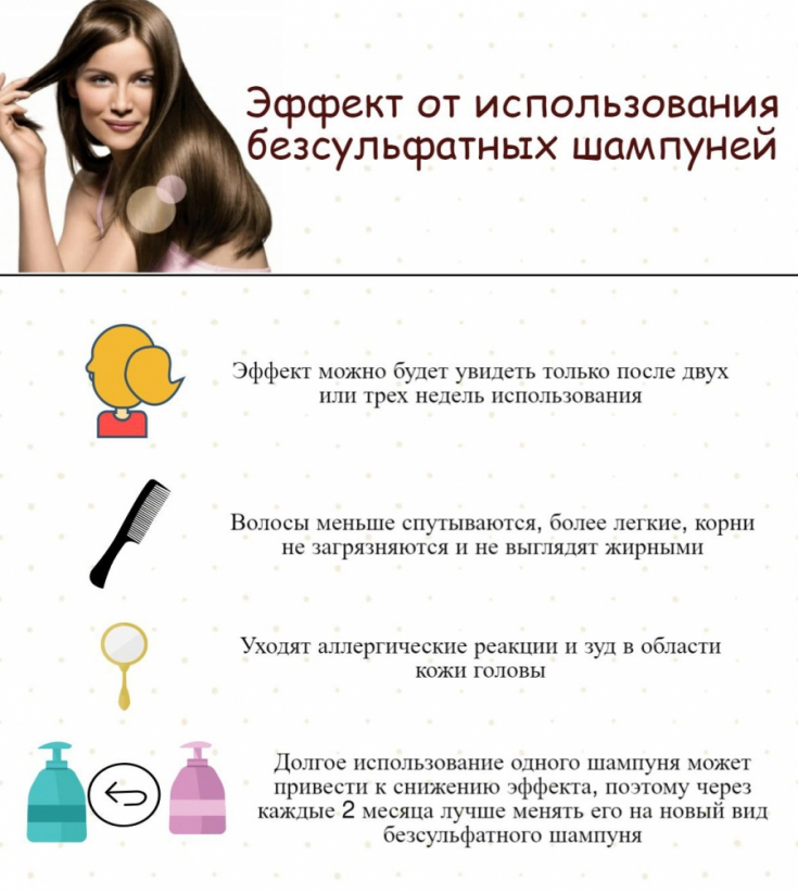 Исчезает привычный блеск и объем, волосы становятся более тусклыми и безжизненными. Но не стоит бояться этих перемен. Уже через 2-4 недели кожа головы и волосы перестроятся, привыкнут к новому моющему средству. Шевелюра быстро вернется к обычному состоянию. А еще через 2-3 недели вы заметите, что волосы стали более живыми, блестящими и крепкими, а прежний объем вернулся.Увеличение стойкости окрашивания. Шампуни с сульфатами раскрывают чешуйки волос, из-за чего краситель вымывается быстро. Бессульфатные средства не имеют такого действия, поэтому их рекомендуется использовать для окрашенных и тонированных, волос.
