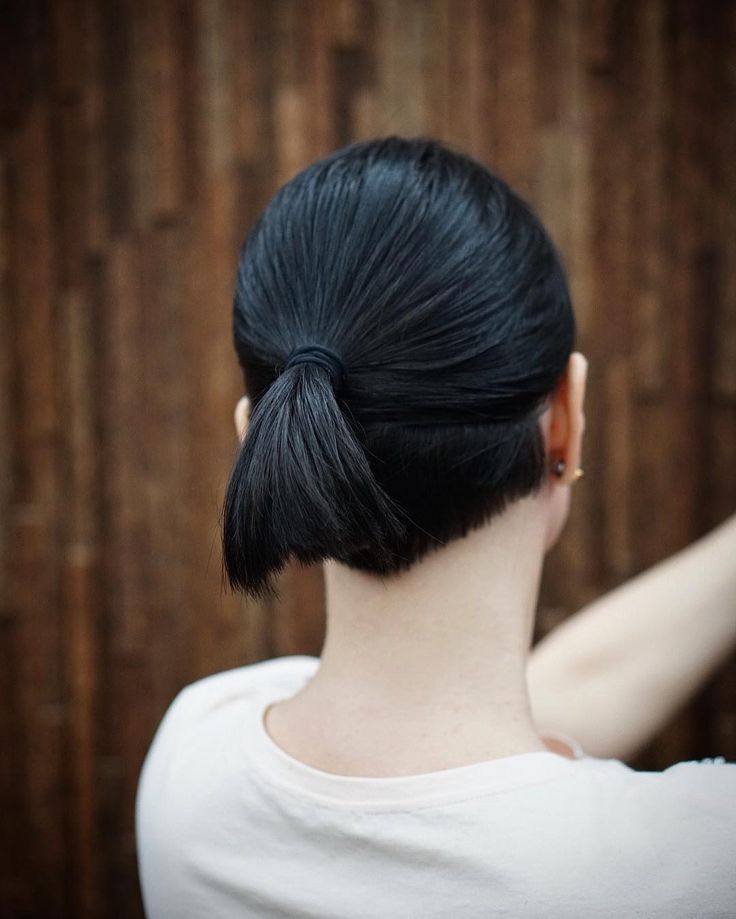 SourceВ этом элегантном образе волосы зачесаны назад и собраны в прямой хвост, который находится высоко на затылке.Несколько прядей оставлены свободными по бокам и сзади.