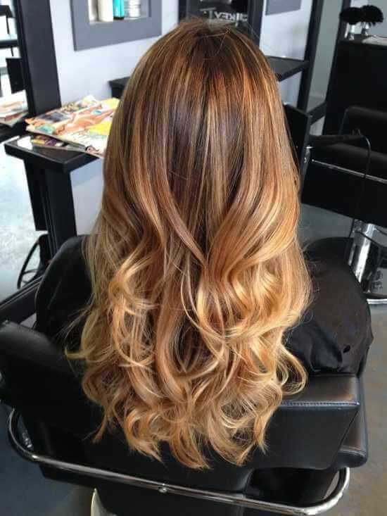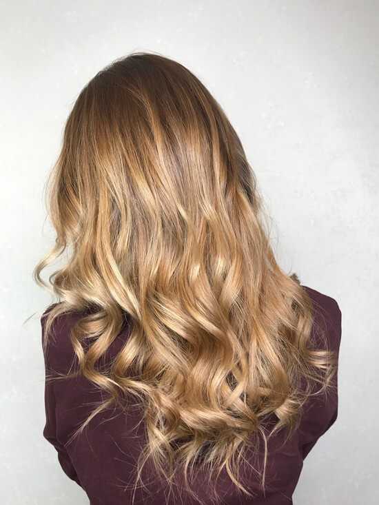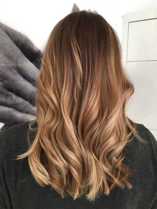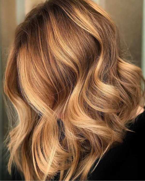 Иначе данный балаяж называют сладким золотом. Особенно роскошно и дорого данное решение смотрится на довольно длинных и вьющихся прядях. Потрясающе комбинируется с русыми и светло-русыми прядками, благодаря чему есть возможность создания максимально натурального вида.