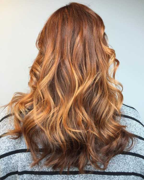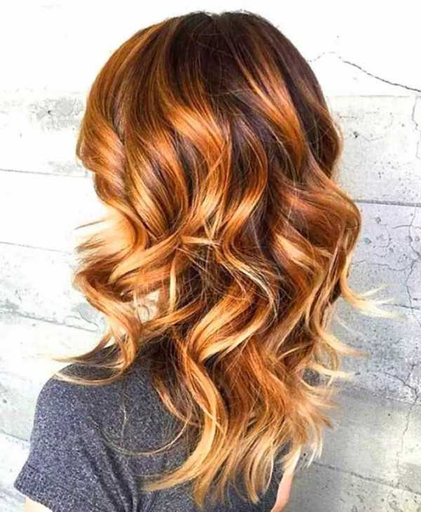 Прекрасно смотрится на русой шевелюре медный балаяж со стильными акцентами в виде янтарных бликов. Главная особенность такого окрашивания заключается в способности визуально увеличивать объем шевелюры практически вдвое!