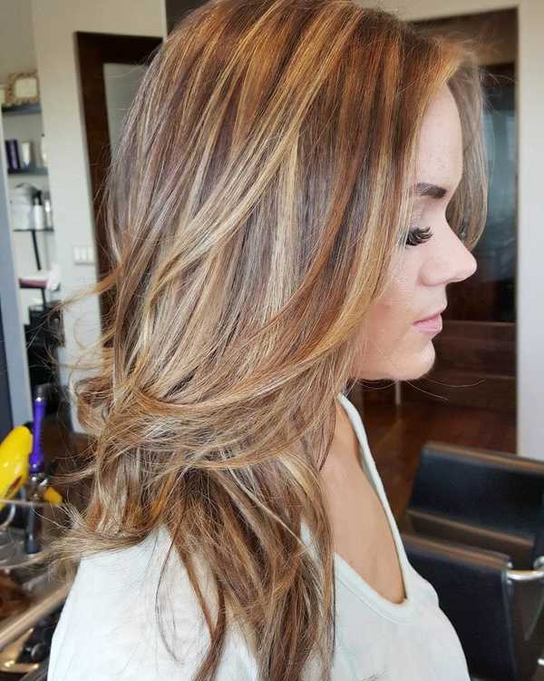 С теплыми русыми волосами восхитительно смотрятся карамельные пряди. Если у девушки достаточно длинная шевелюра, мастер может предложить некоторые локоны выделить от самых корней, а некоторые только на кончиках – такой прием выглядит максимально эффектно и стильно.