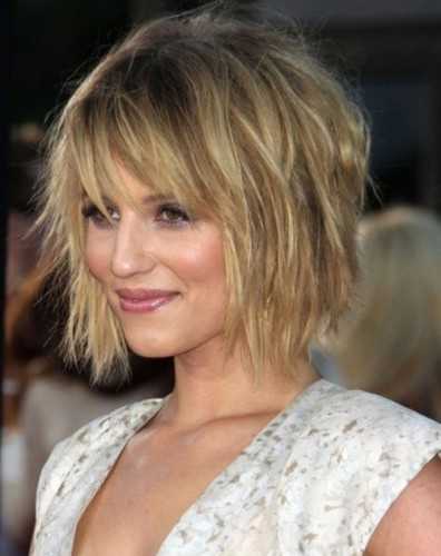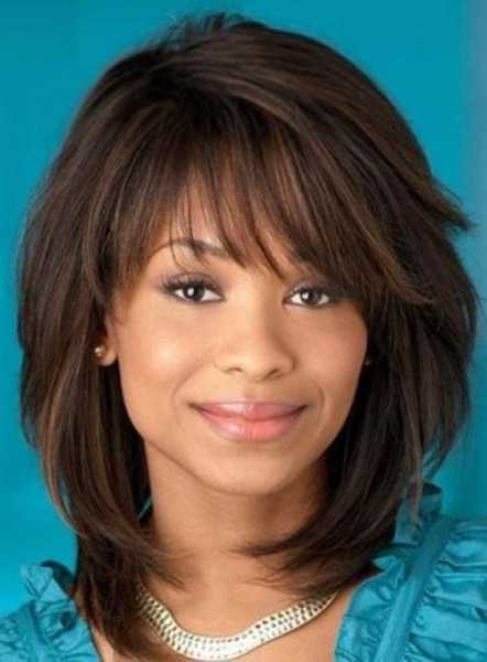 Прическа добавляет объем, убирает чрезмерную пышность и подходит для любого возраста. Создать игривый образ можно на средних волосах с косой удлиненной челкой.
