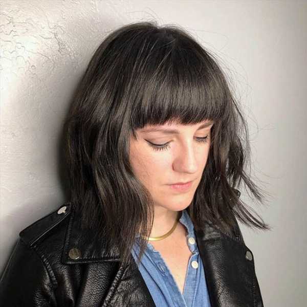 - Строгий и загадочный образ легко создать с помощью идеально прямой челки до бровей – она также не сдает своих позиций. Самый модный вариант будет в меру густым и без объема у корней.