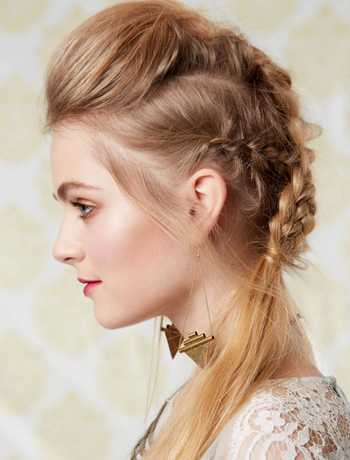 Потрясающая, немного дерзкая прическа, для независимых девушек. Делается достаточно просто. На первом этапе необходимо разделить волосы косым пробором. Из большей части, начиная ото лба по направлению к затылку, сплести косу плетением «колосок» и зафиксировать её резинкой. На затылке необходимо сделать небольшой начёс из оставшихся волос, слегка пригладить и собрать их в хвост, прихватывая при этом к общей массе и саму косичку. Зафиксировать хвост резинкой.