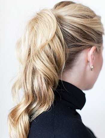 Простая укладка, которая создаст эффект объёмного хвоста. Для начала нужно придать прядям объём, который легко создать при помощи завивки. Затем слегка начесать локоны в верхней части головы. По линии ушей необходимо сделать горизонтальный пробор и закрепить верхнюю часть локонов, чтоб не мешали. Из нижней части прядей собрать хвост и завязать незаметной резинкой. Далее собрать тугой резинкой верхнюю часть прядей и опустить локоны, хорошенько их, расправив, закрывая нижнюю резинку. Двойной хвост готов.