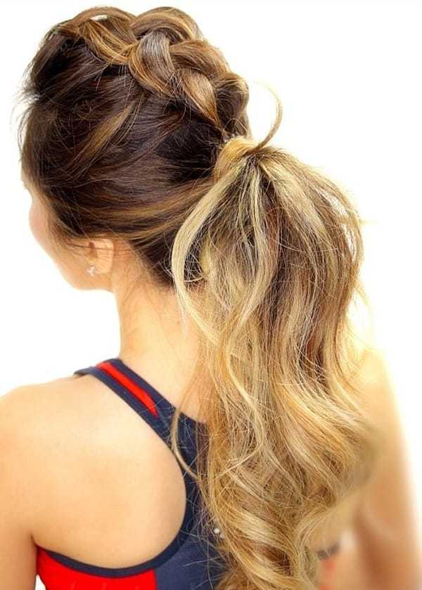 Достаточно строгая и красивая укладка – это хвост с косой. Если они пышные, то прическа будет смотреться очень хорошо. Но если волосы тонкие, то здесь на помощь придет обычный начес, который исправит положение.