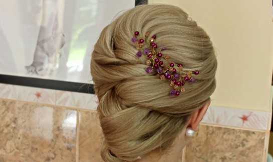 - Теперь нужно заплести косу и вокруг резинки аккуратно обернуть. Всю прическу фиксируют шпильками. Также можно использовать и невидимки.