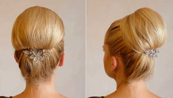 Эта причёска будет очень кстати, при необходимости прибрать волосы, чтобы они не мешались. Да и сделать её может почти любая. Ну что? Приступаем? Соберите шевелюру в высокий хвост, желательно собрать её в очень высокий хвостик – так причёска будет смотреться лучше. Затем невидимыми заколками крепим наш хвост к волосам, заворачиваем назад и последний штрих – спрыскиваем фиксирующим лаком. Далее хвостик закручиваем валиком и опять закрепляем. А сейчас нам необходимо пучок немного растянуть по сторонам и закрепить края пучка шпильками. Для украшения вы можете включить фантазию украсить, например, причёску необычным аксессуаром.