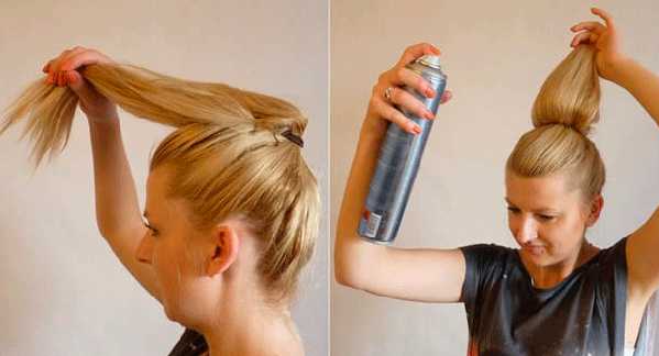 На макушке головы завязывается плотный хвост. Он делится на две половинки: верхнюю и нижнюю. Верх убирается на время, а низ начесывается расческой. Начесанная часть собирается в бобину и фиксируется заколками.