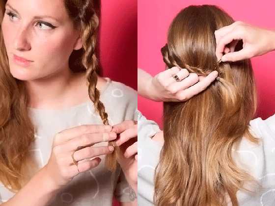 Вы хотите ходить с распущенными волосами, но чтобы при этом они вам у лица не мешались? Тогда этот вариант точно для вас. Отделите пряди от височной части и соберите их в косичку. Нам нужно будет заплести две косички с двух сторон. Затем косы на затылке перекрещиваются и фиксируются шпильками или невидимыми заколками.