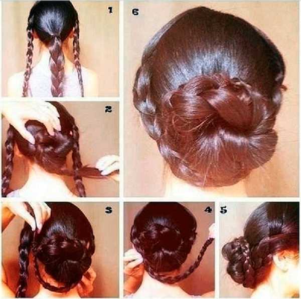 Чтобы его заплести уходит 10 минут. Расчесанные локоны делятся на три одинаковые части. Каждая из них заплетается в косичку. Готовые косички сворачиваются в пучок и фиксируются шпильками.