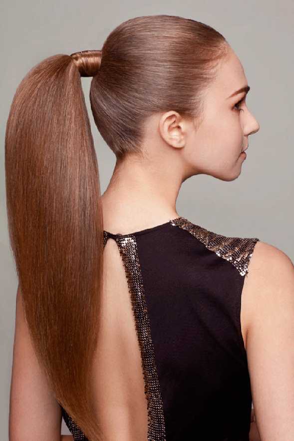 - Чистые волосы завязываем в высокий плотный хвост на макушке, загладить все огрехи. Вьющиеся локоны нужно выровнять парикмахерским утюжком.