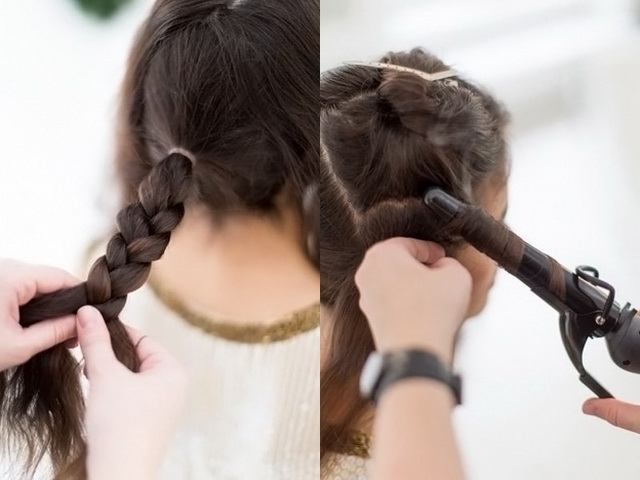- Потом закрепите их невидимками, а концы накрутите плойкой. Полученные завитки скрутите колечком и прикройте места с невидимками.